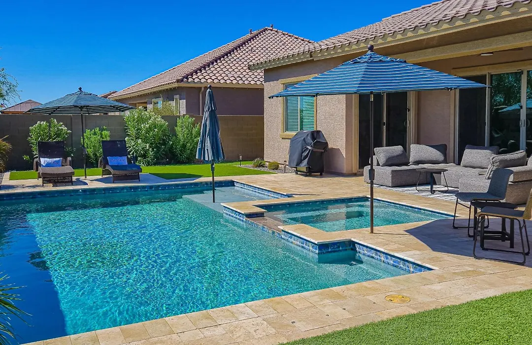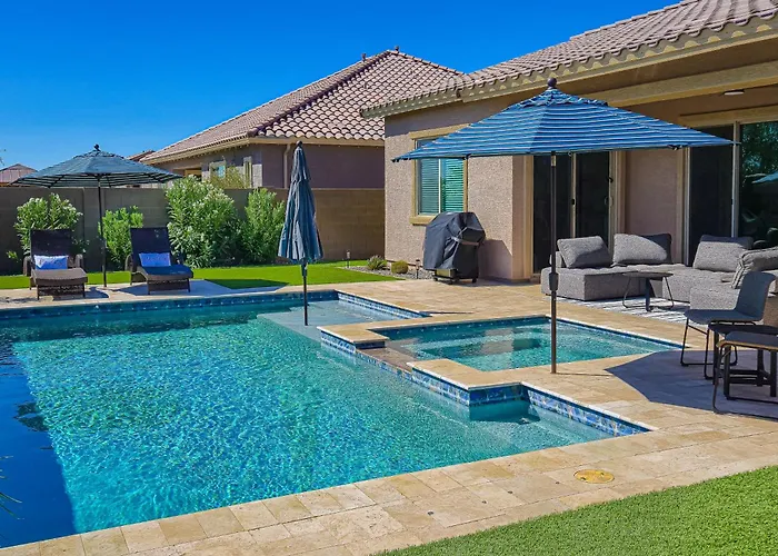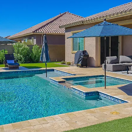 In-room dining is easy with amenities like an electric kettle, a fridge, and a kitchenware in an equipped kitchen. The villa is also a 26-minute drive from Phoenix Goodyear. The presence of a private swimming pool, along with a spa bathtub, ensures guests additional relaxation. Hiking and cycling are also provided for sports enthusiasts.